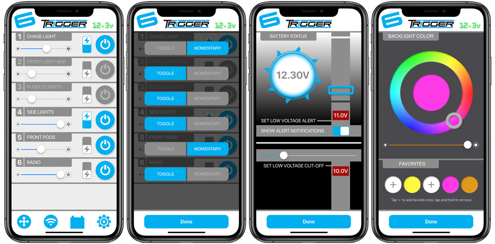 The TRIGGER ACS Plus mobile app interfaces with a system of connected power distribution accessories designed for the off-road and power sports vehicle segments. Available for iOS and Android phones and tablets, the app is designed from the ground up to provide clear and concise hardware control via Bluetooth protocols.